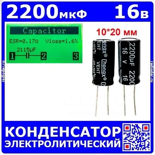 2200мкФ*16В -конденсатор электролитический (2200uF/16V, ±20%, -40+105°C, 10*20мм) - ChongX (10100085)