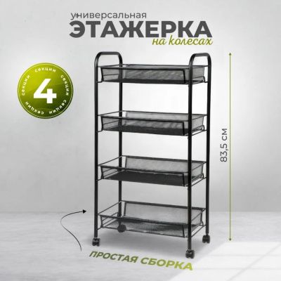 Этажерка универсальная, сталь, 4 секции, 42.5х26х83.5 см, на колесах, с мелкосетчатыми корзинами, черная, LD01-628-1